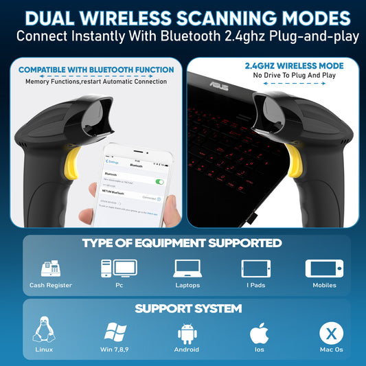 Brontix X2-Cordless 2D & 1D Super Fast Barcode Scanner Wireless & Wired 2.4GHz | QR Code Scanner Rechargeable | USB Handheld Barcode Reader with Induction Scanning, Built-in Light, ABS Body